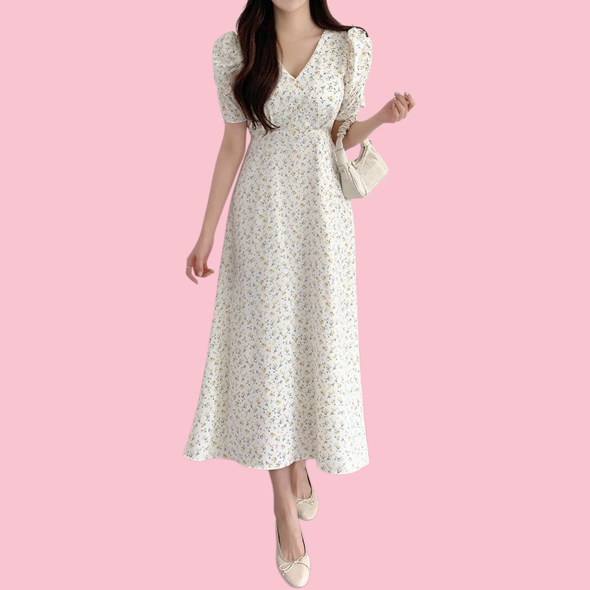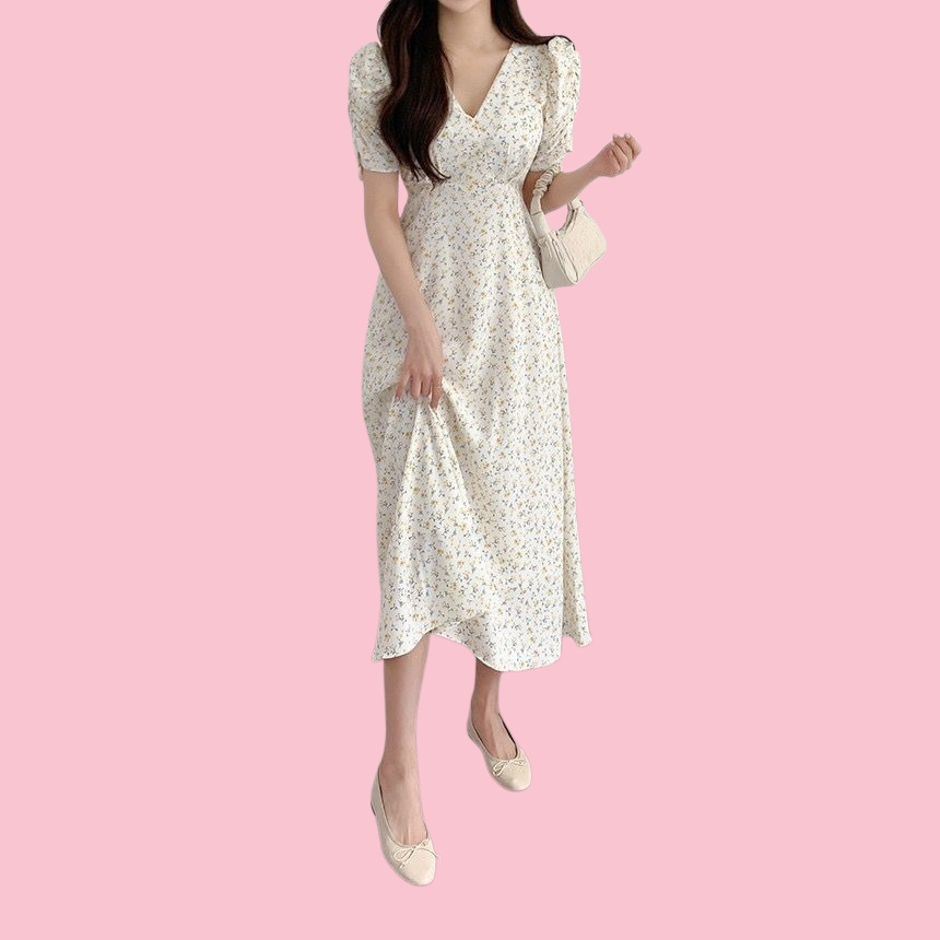 포근한 분위기 브이넥 허리끈 플라워 원피스