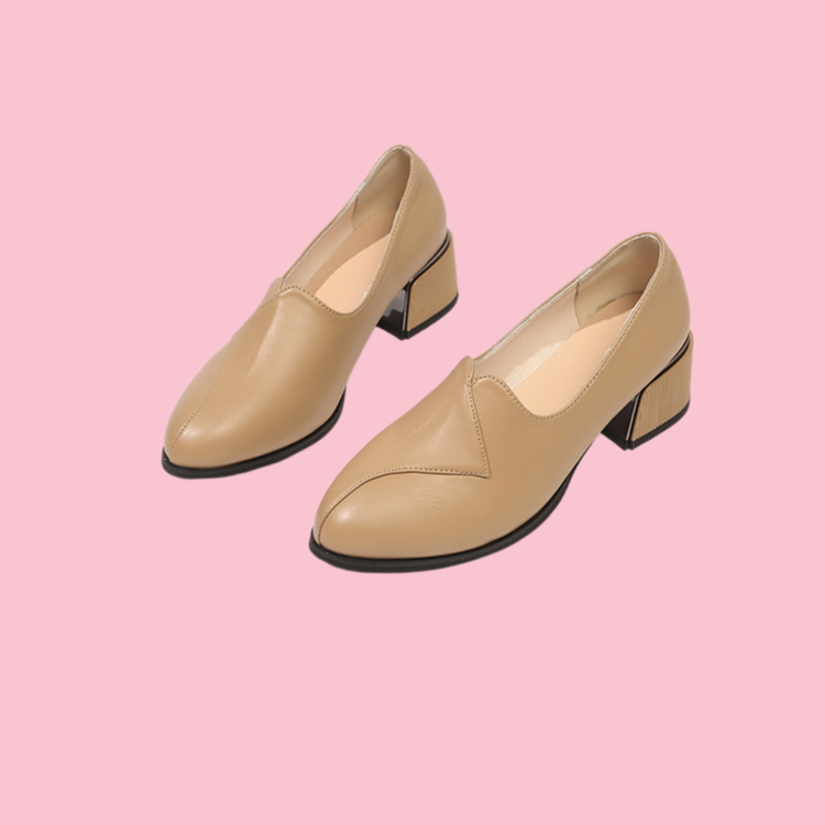 굵은 굽과 뾰족한 앞코 디자인으로 다리 라인을 길어 보이게 연출하며, 미끄럼 방지 밑창과 편안한 착화감이 특징인 여성용 작은 구두